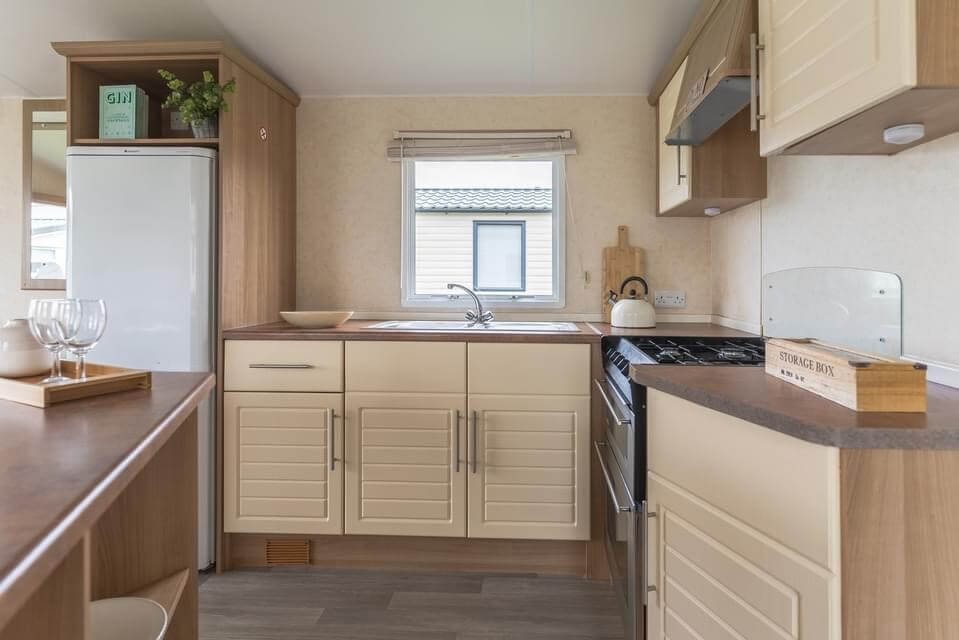 As well as that the kitchen also has a modern feel to it with spacious units which house an integrated fridge/freezer and full sized Gas Cooker. The kitchen provides ample space and plenty of work top space to allow you to cook comfortably. Whether you’re cooking for just you or entertaining family and friends in your beautiful Holiday Home.