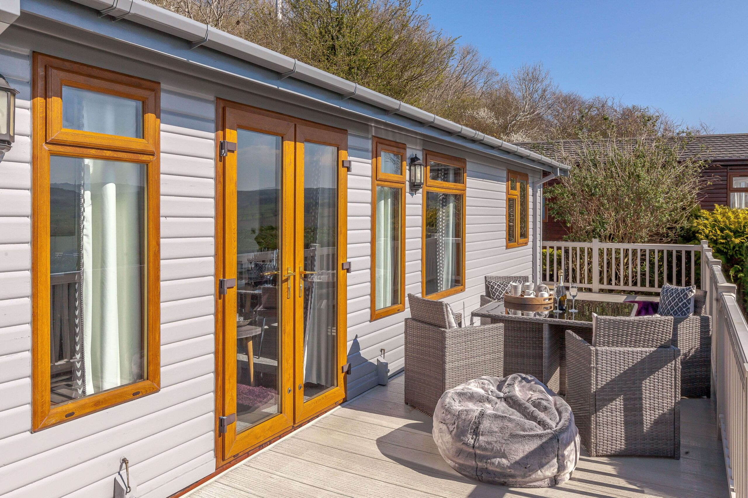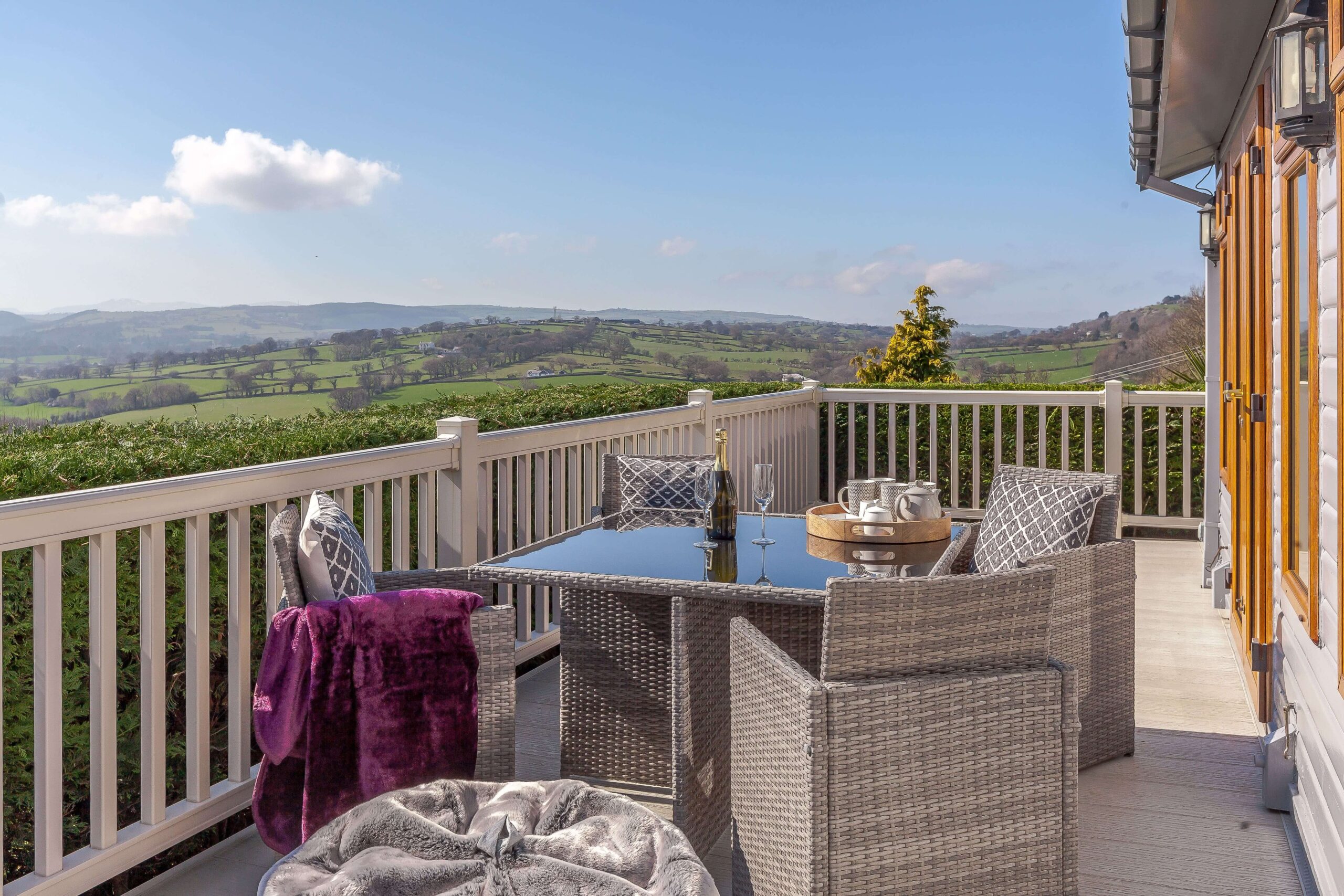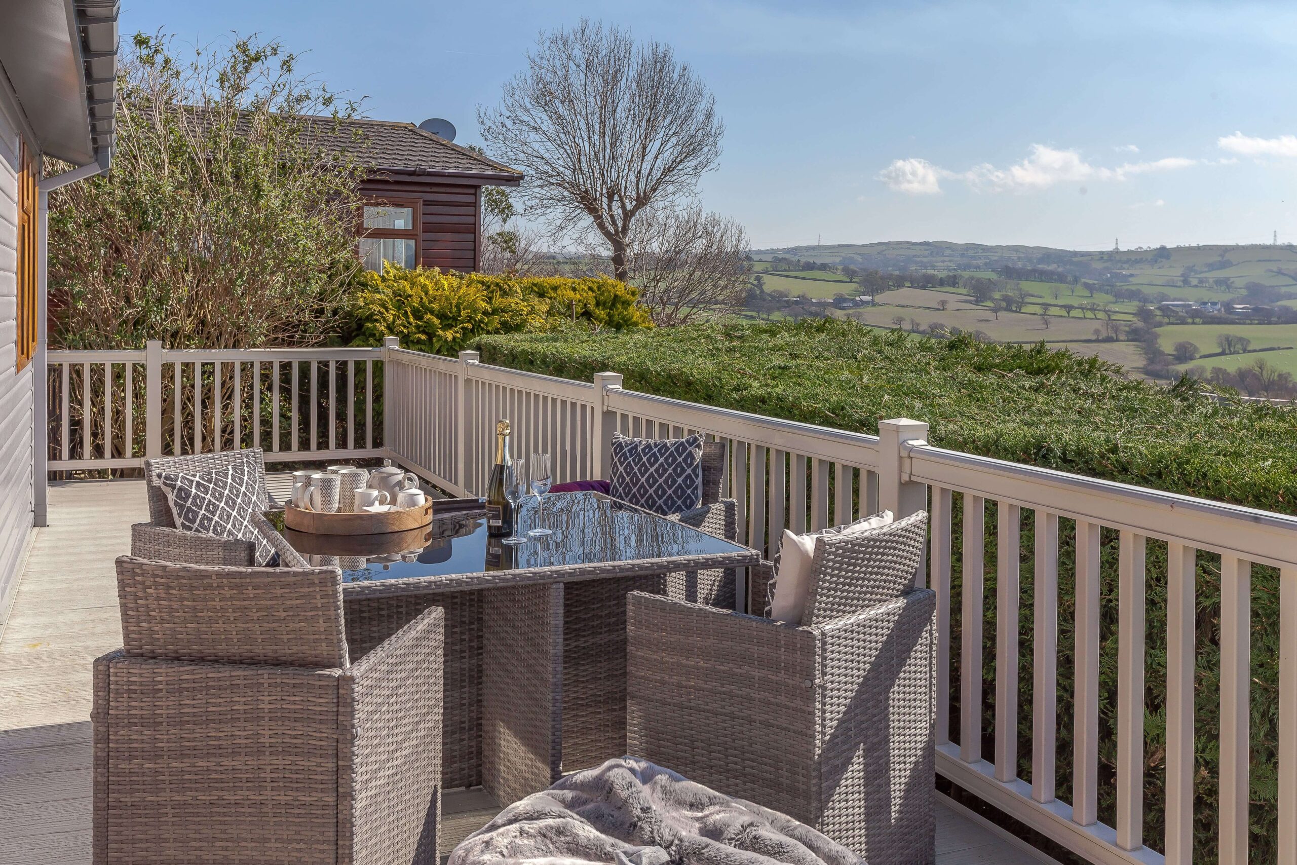 Also located in the living space is a comfortable sofa and flat screen TV in the lounge; effectively everything you will need for a romantic movie night in. The French patio doors permit plenty of natural light to radiate into the living area and lead out onto your private decking area which boasts spectacular panoramic views of the Clwydian hills. In addition to your private hot tub, you will also find quality outdoor furniture here too in case you care to dine alfresco.