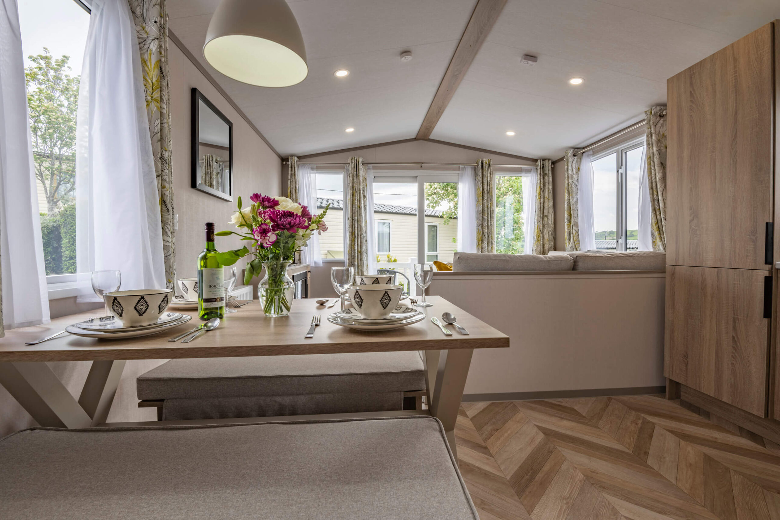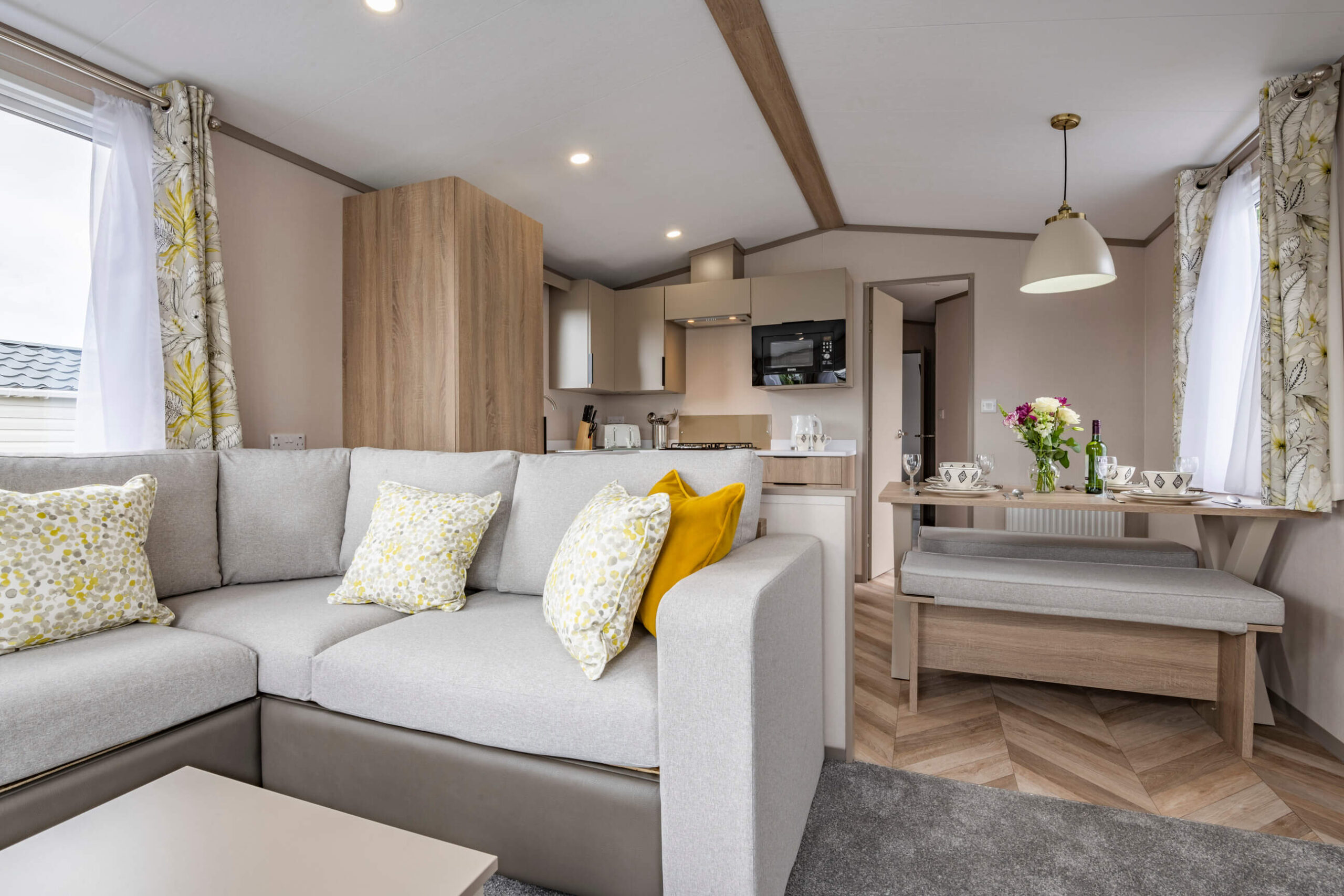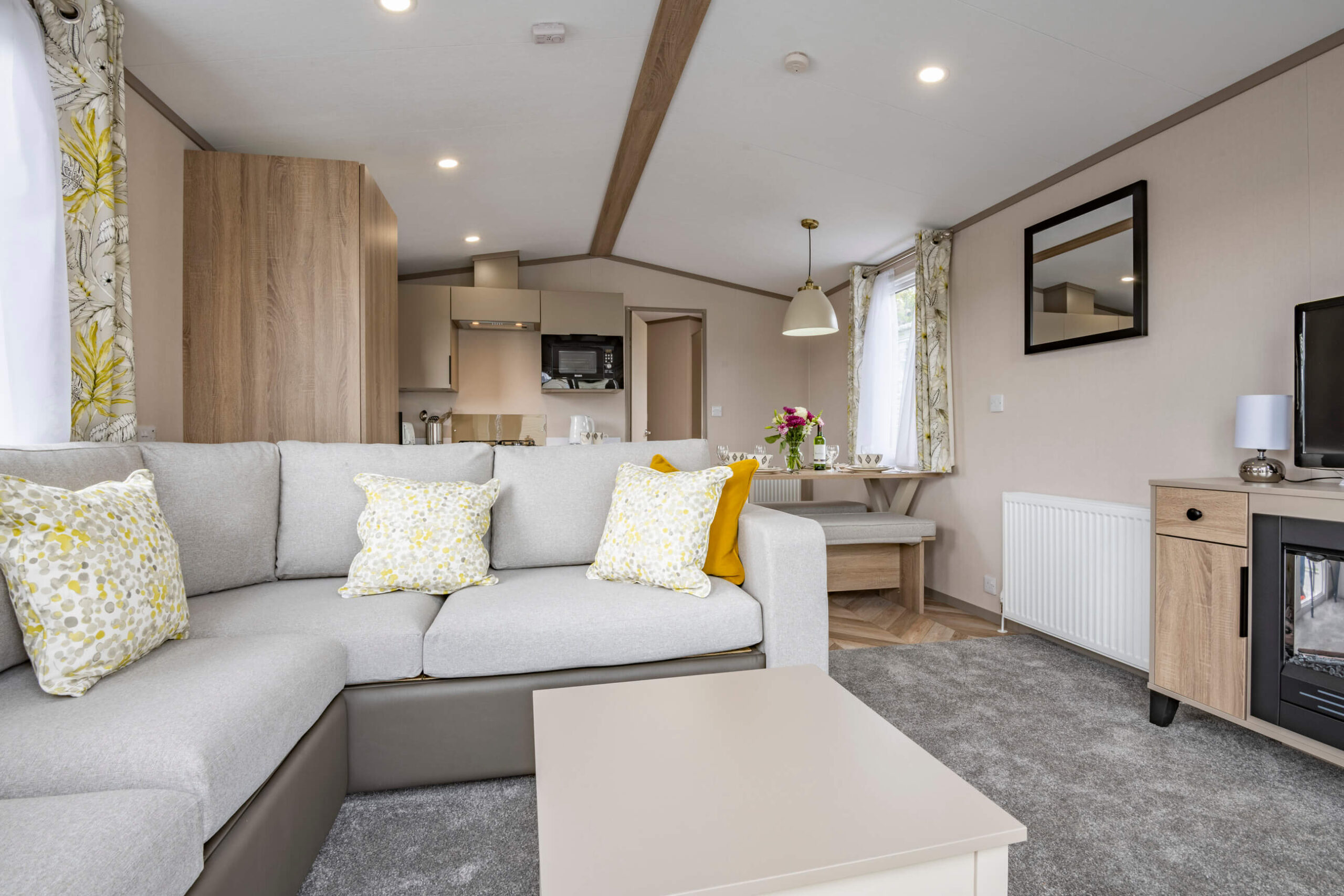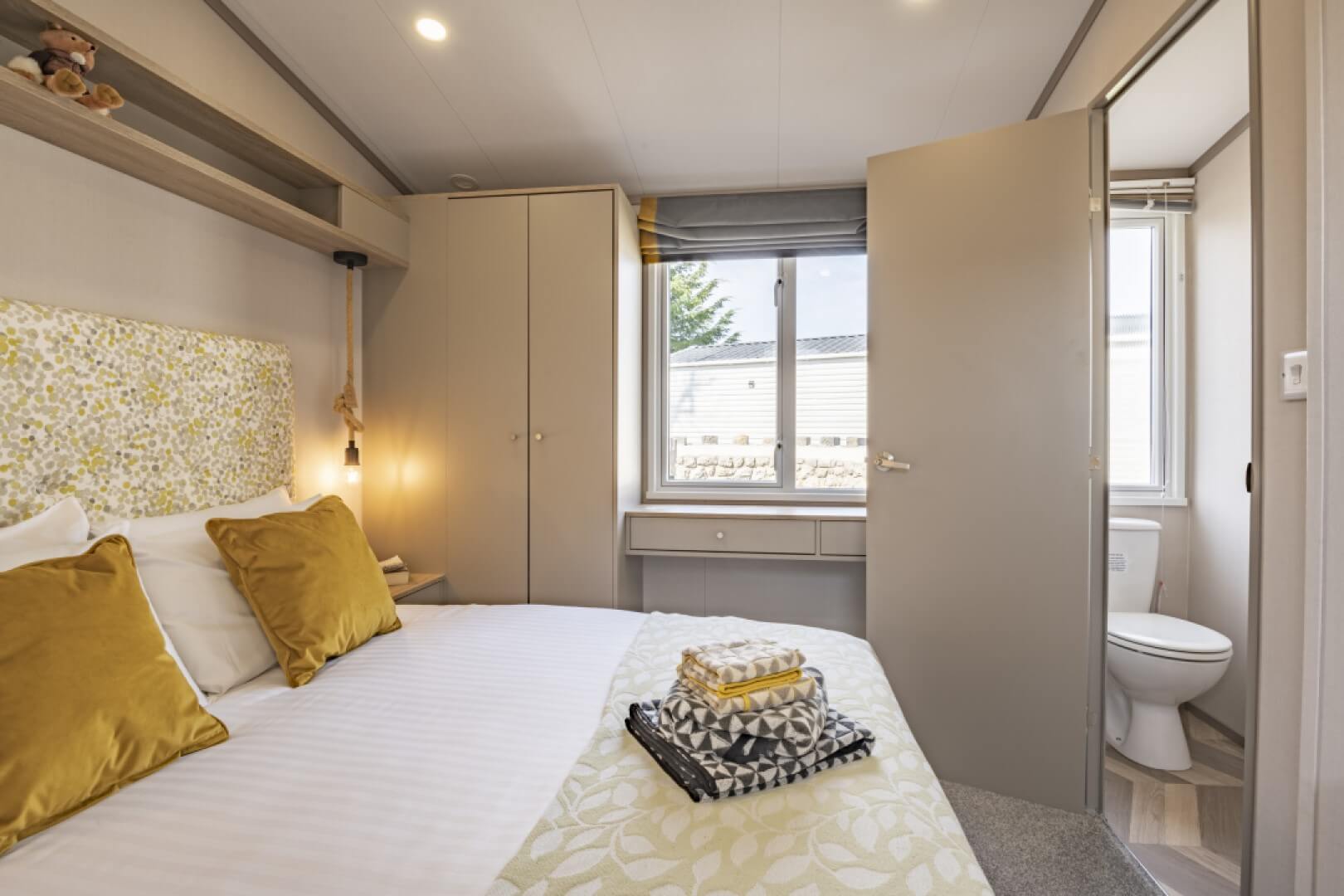 Our Conwy caravans come with all of the comforts of home, styled in a modern and bright colour scheme throughout. This includes the 3 bedrooms which consist of two twin rooms alongside the master bedroom, with each featuring USB charging points and ample storage space in which to keep your personal belongings. The master bedroom also has its own wall mounted TV and ensuite WC for your convenience. This is in addition to the family bathroom which offers a bright and clean space with a large shower enclosure, WC, basin and mirrored vanity cabinet.
