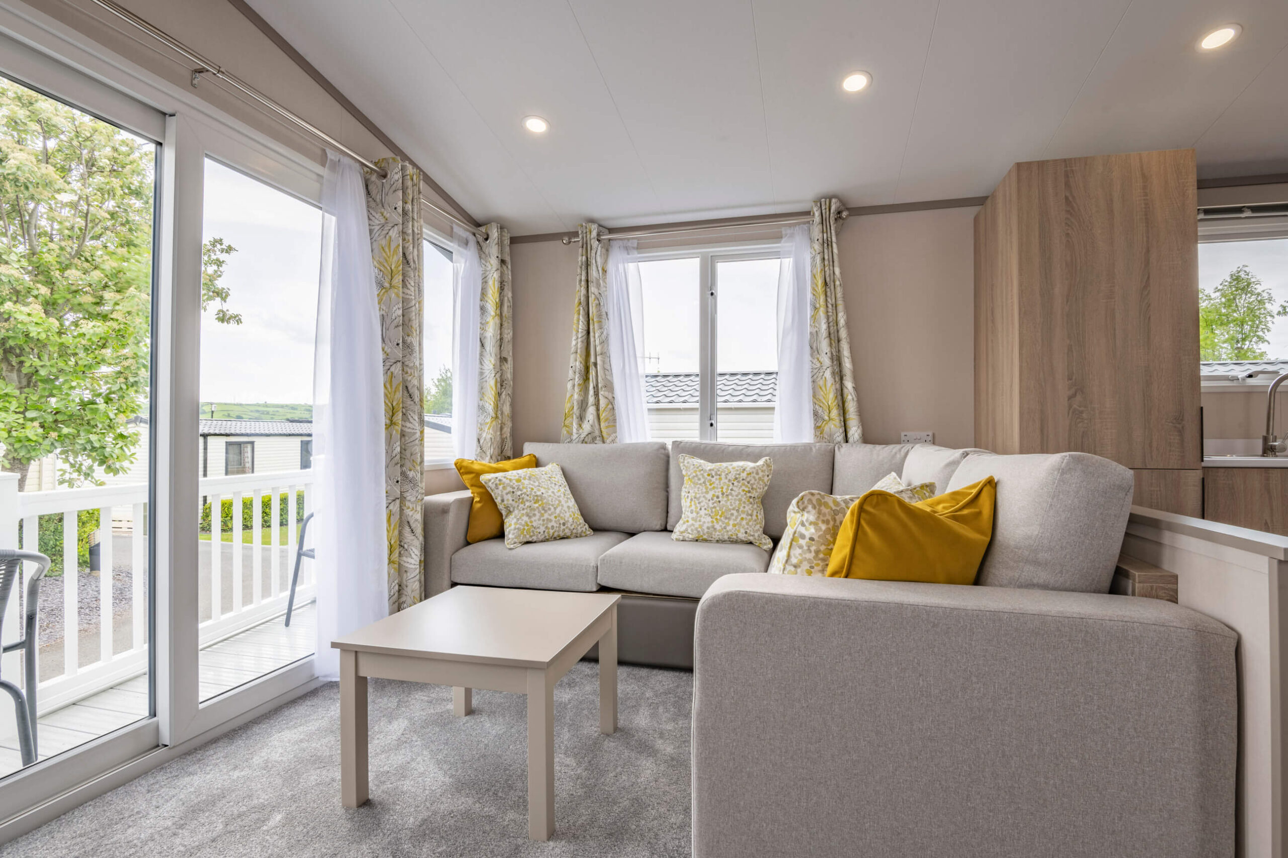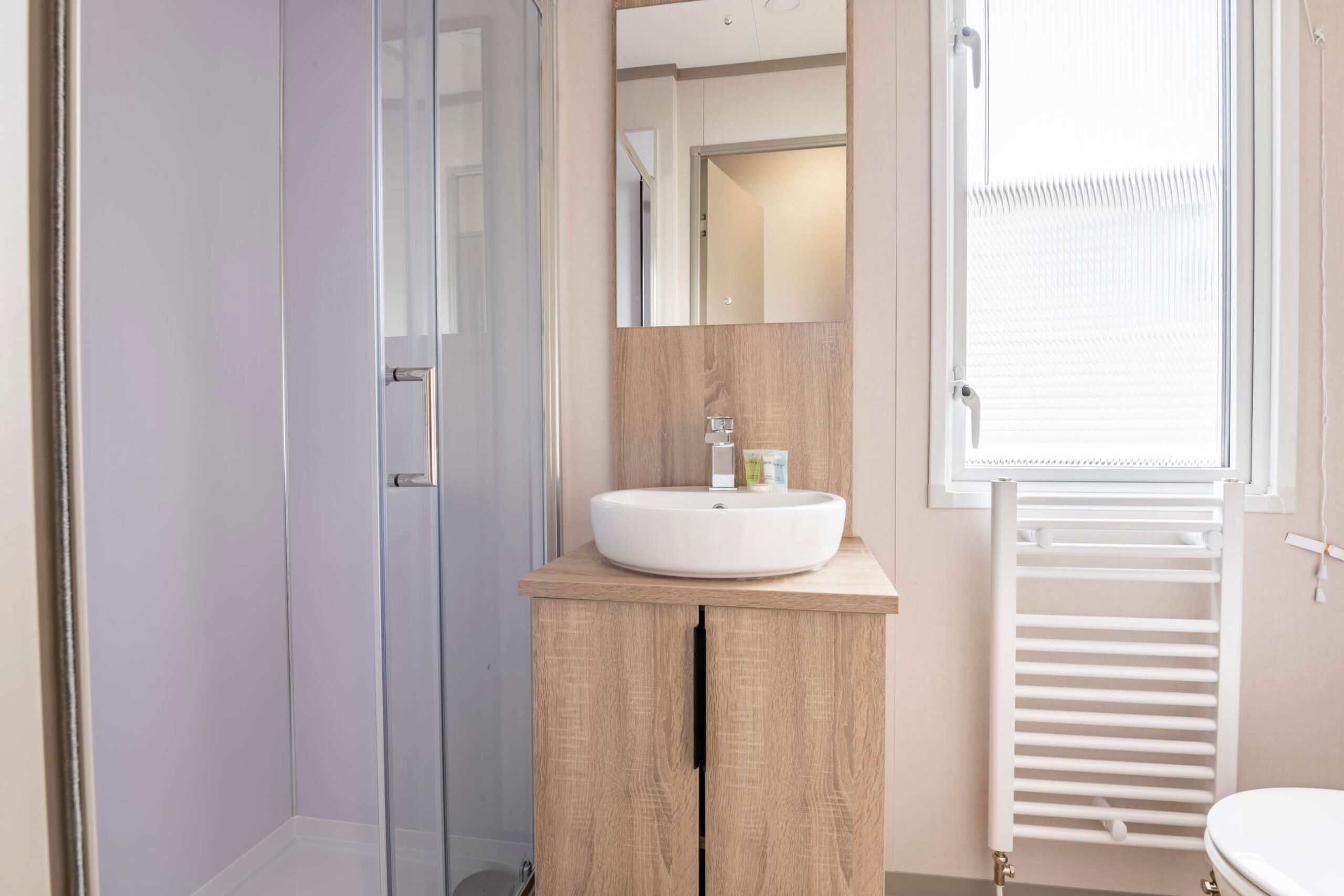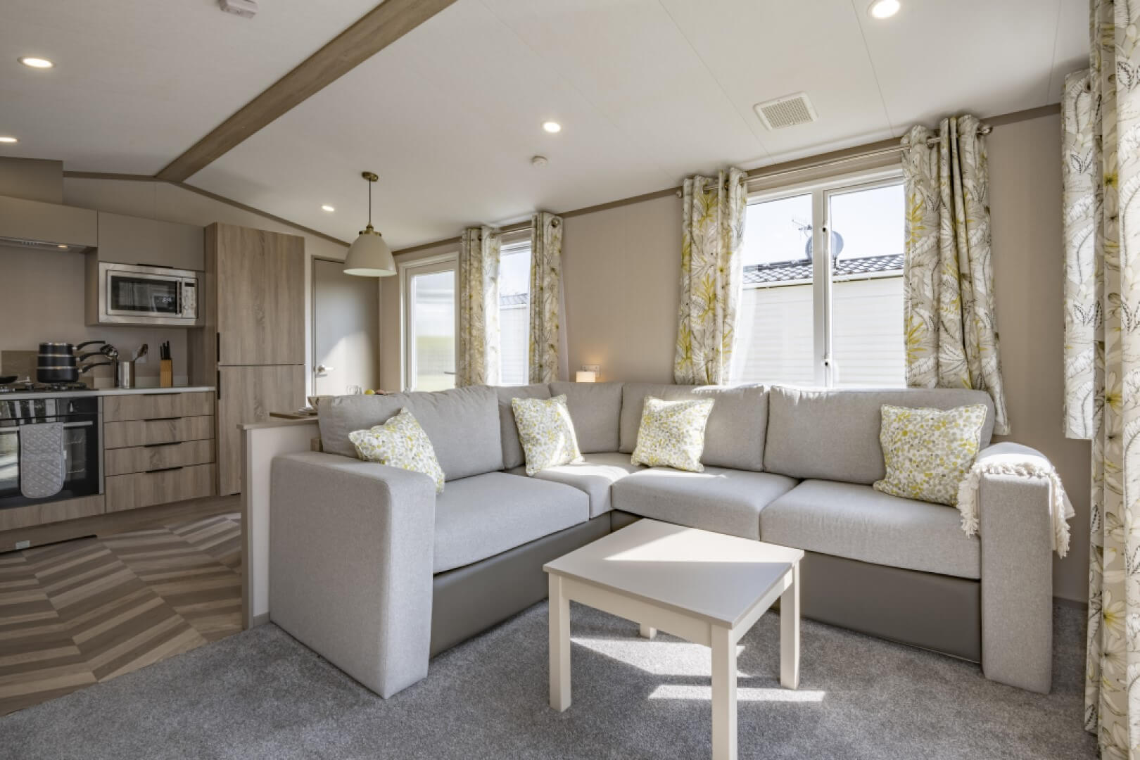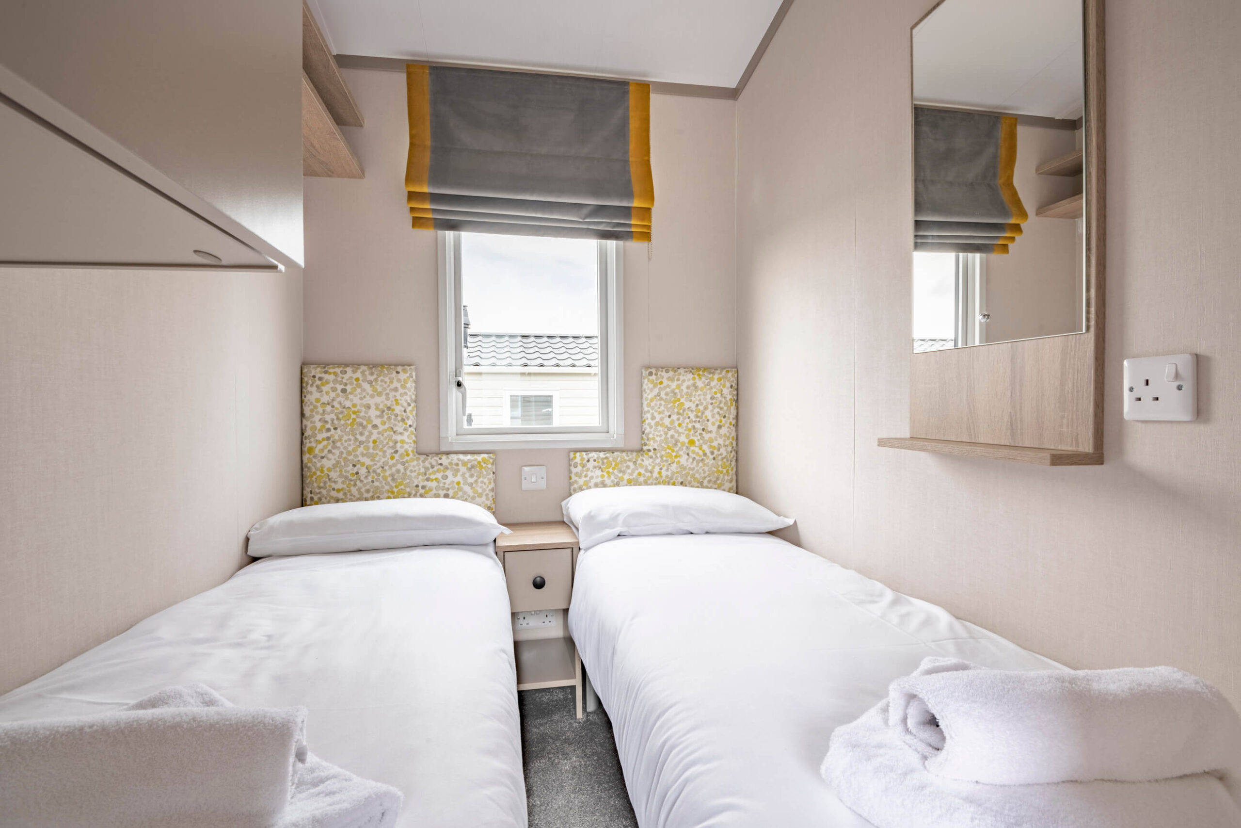 Our Conwy caravans come with all of the comforts of home, styled in a modern and bright colour scheme throughout. This includes the 3 bedrooms which consist of two twin rooms alongside the master bedroom, with each featuring USB charging points and ample storage space in which to keep your personal belongings. The master bedroom also has its own wall mounted TV and ensuite WC for your convenience. This is in addition to the family bathroom which offers a bright and clean space with a large shower enclosure, WC, basin and mirrored vanity cabinet.