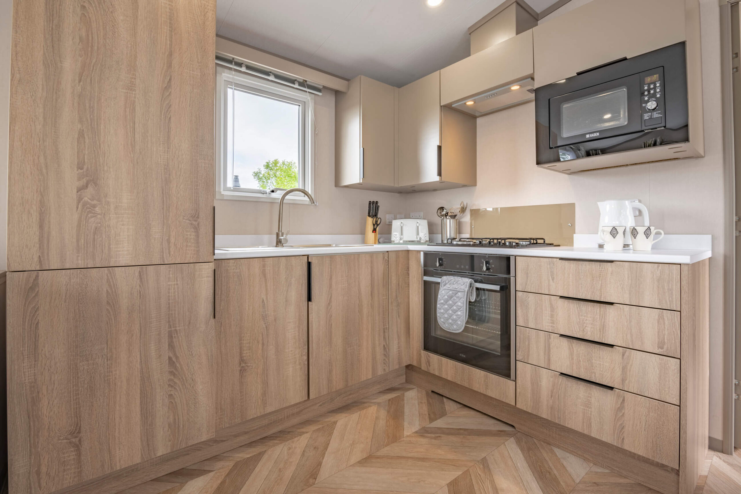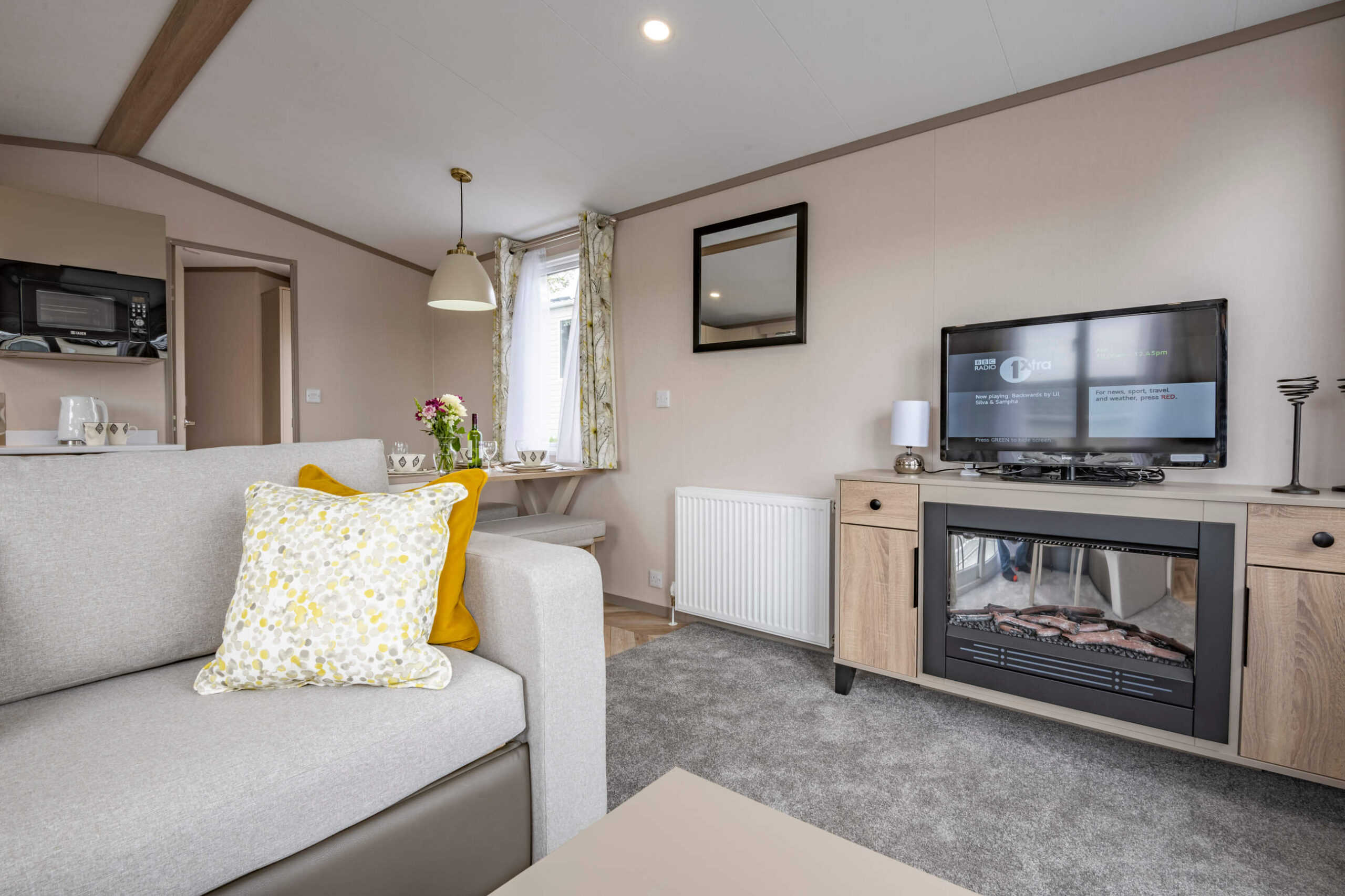 If you require additional sleeping space, then you can make use of the pull down sofa bed in the lounge. During the day, this lounge area is the ideal spot for relaxing with the family or catching up with your favourite TV programmes, with a flat screen TV provided alongside a warming fireplace. You’ll be sure to be warm & cosy in any season, with the Conwy caravan also being double glazed and centrally heated.