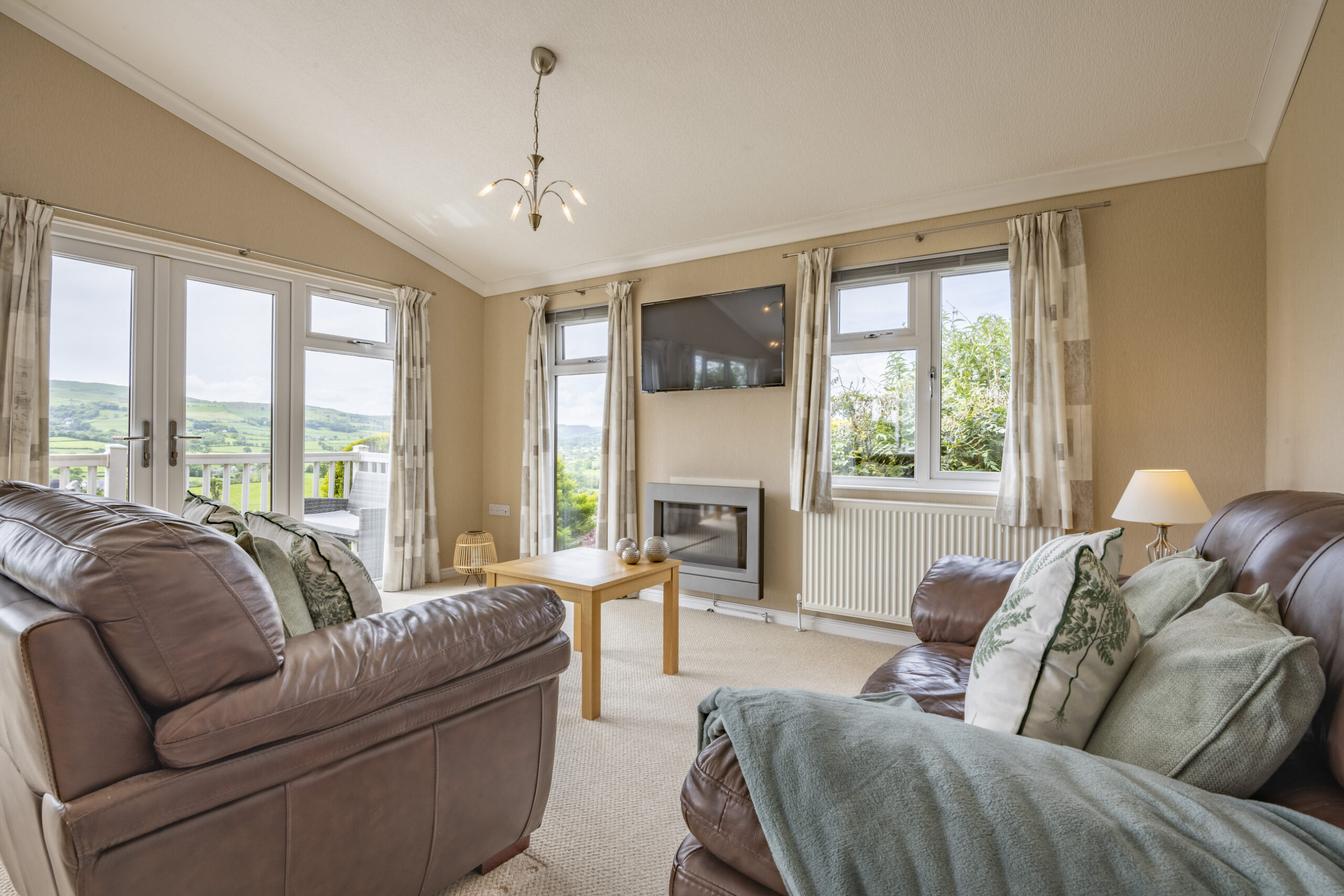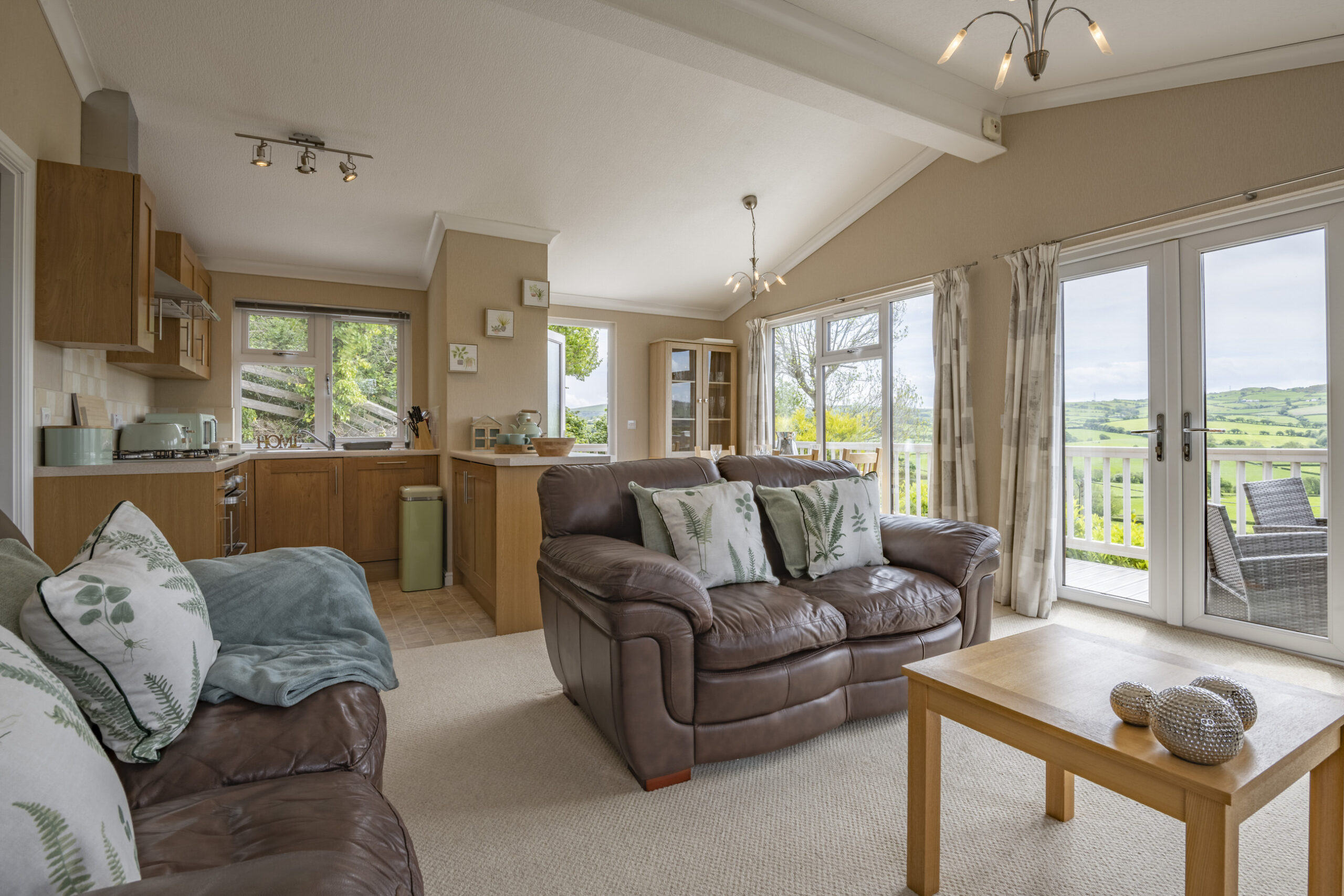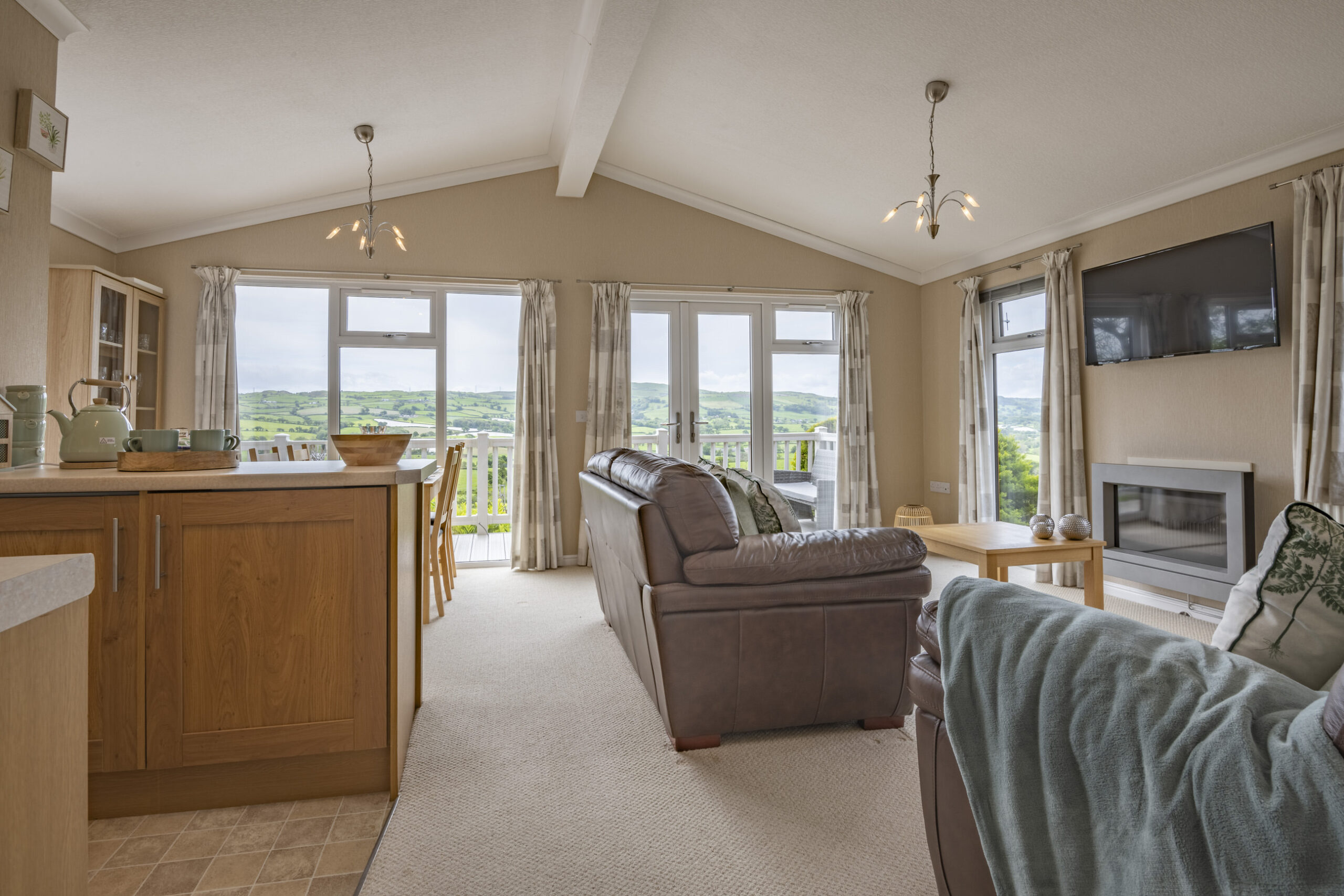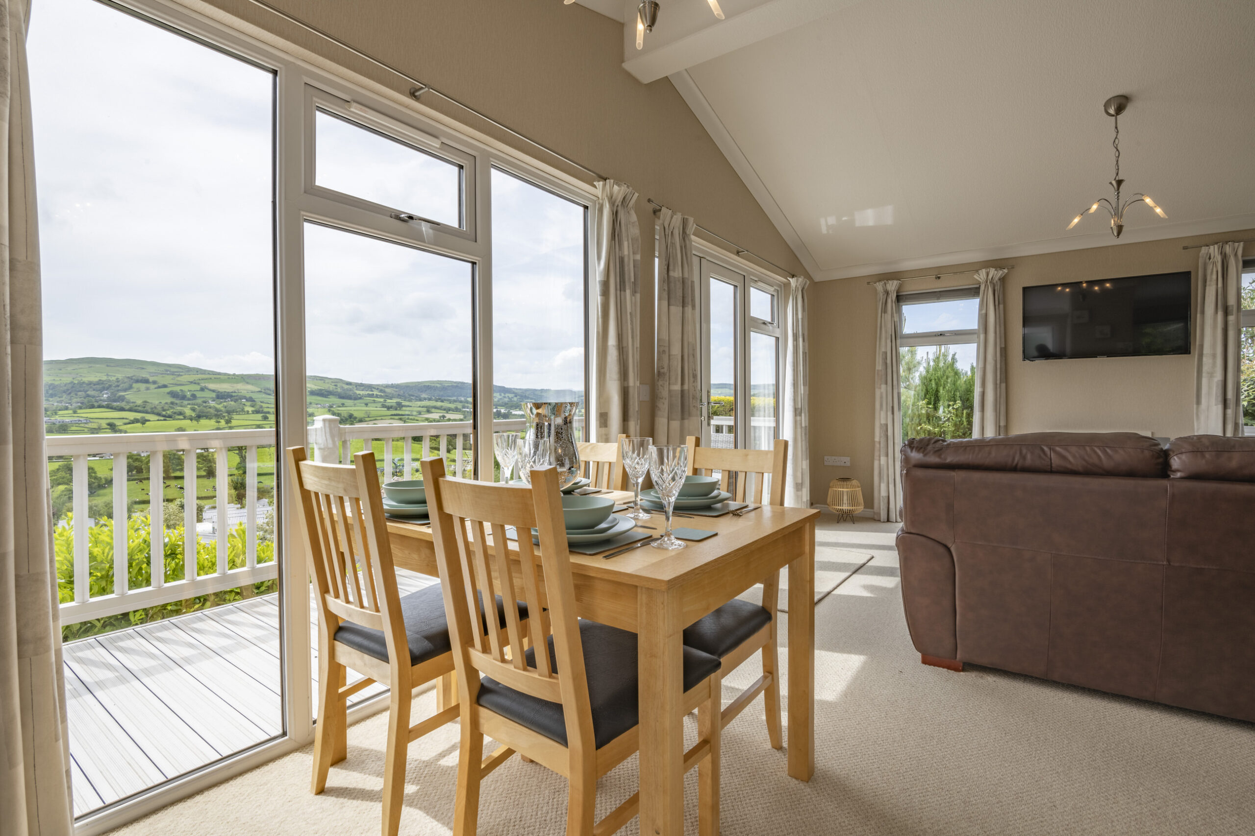 The living area is warm and cosy with two large leather sofas which face the wall mounted flatscreen TV. To the side of the living area, patio doors open out onto your private decking which boasts panoramic views of the Clwydian Hills.
