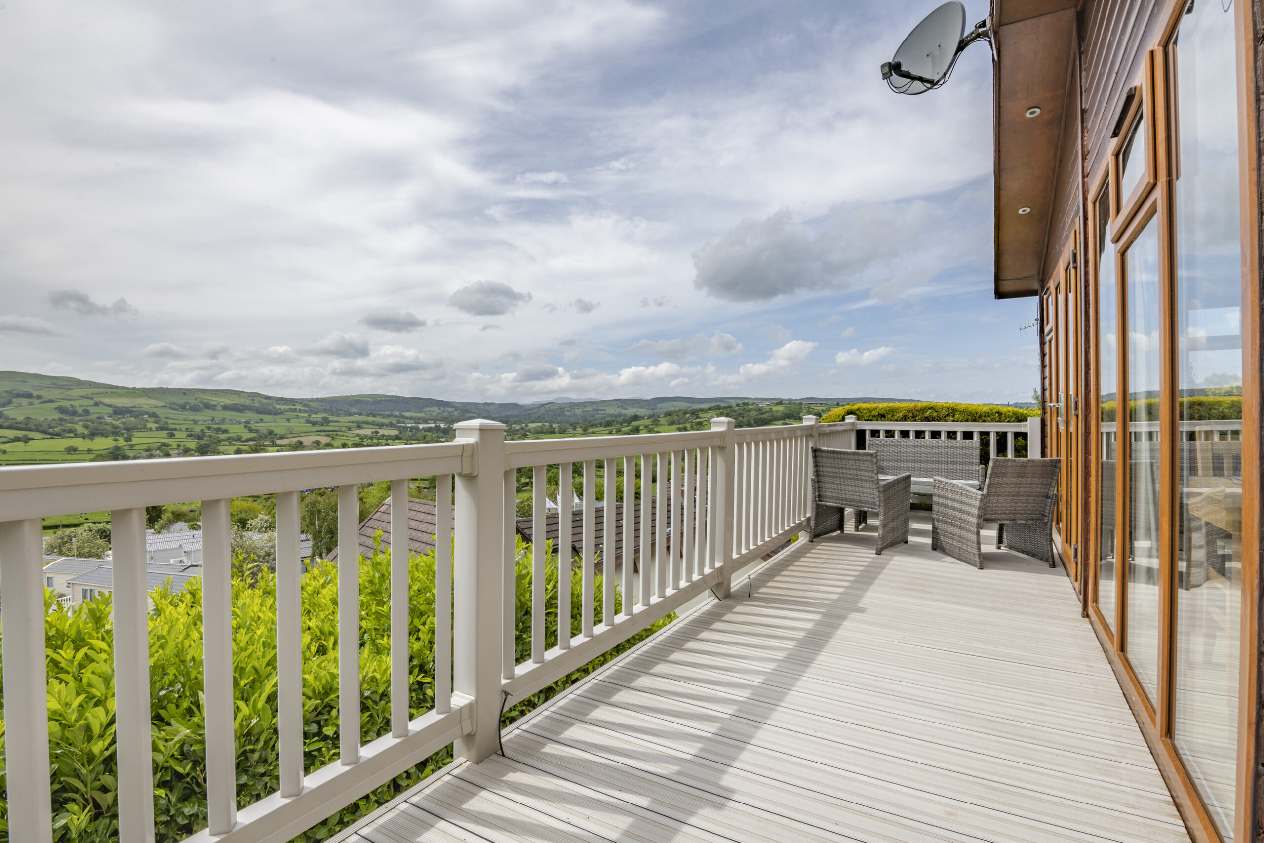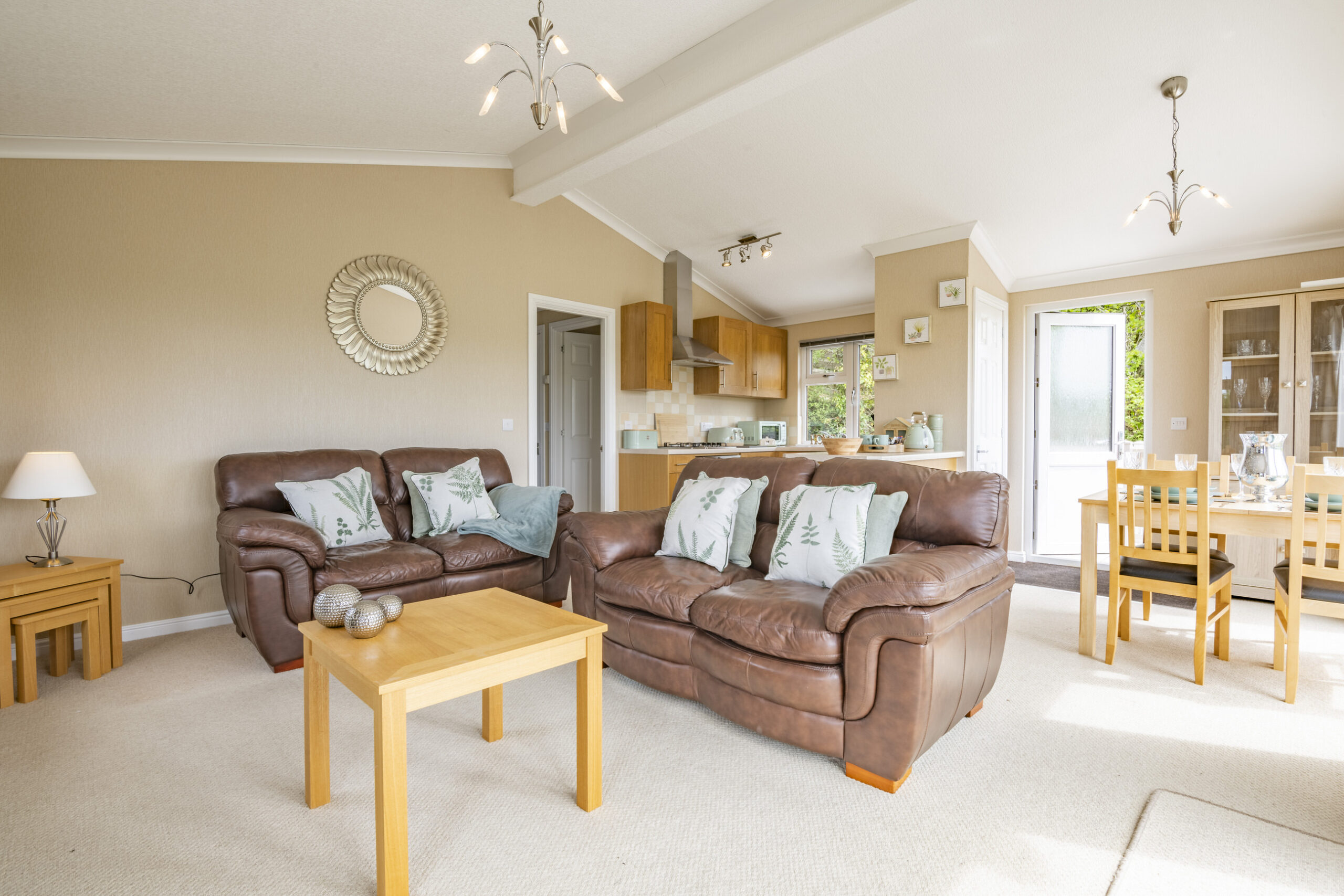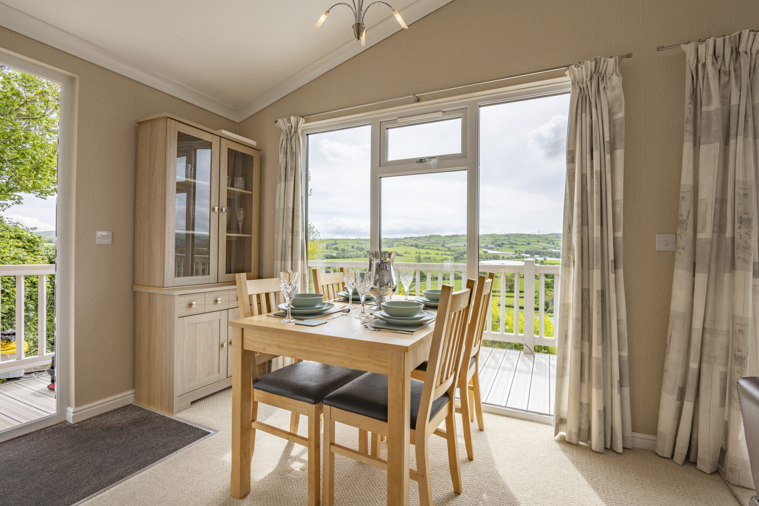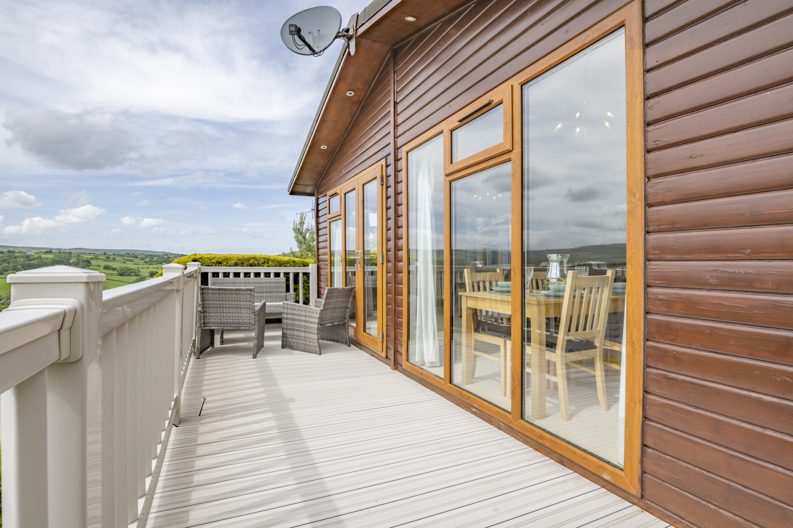 The living area is warm and cosy with two large leather sofas which face the wall mounted flatscreen TV. To the side of the living area, patio doors open out onto your private decking which boasts panoramic views of the Clwydian Hills.
