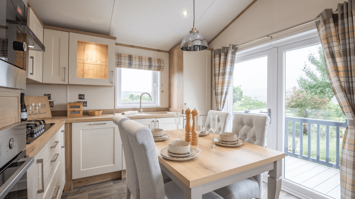 This particular Love Oakland Lodge has been designed to offer a rustic yet sophisticated charm with the open plan living area featuring a warming log burner effect fire and oak finishes. The large windows ensure that plenty of light enters the space which also features your fully equipped kitchen. With its central island and bar stools, the kitchen creates a casual ambience without hampering any of the practicality. In fact, you’ll enjoy a wealth of integrated appliances ensuring that you have everything that you need in order to create meals that the whole family will enjoy.