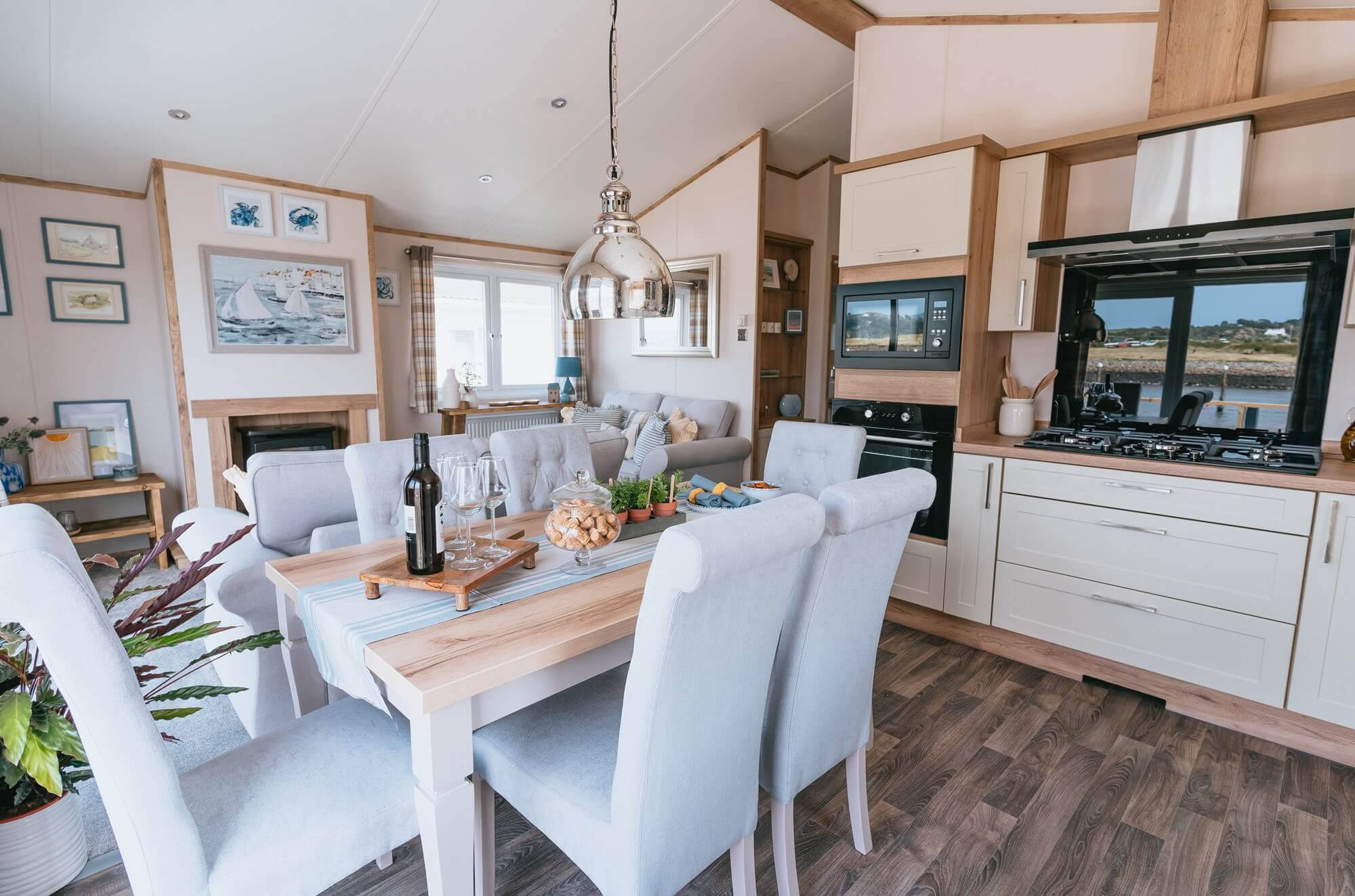 The open plan living area consists of a lounge area which comes complete with comfortable cream sofas and feature wood burner fireplace which is the perfect place to unwind with the family during the winter months and enjoy a movie night.