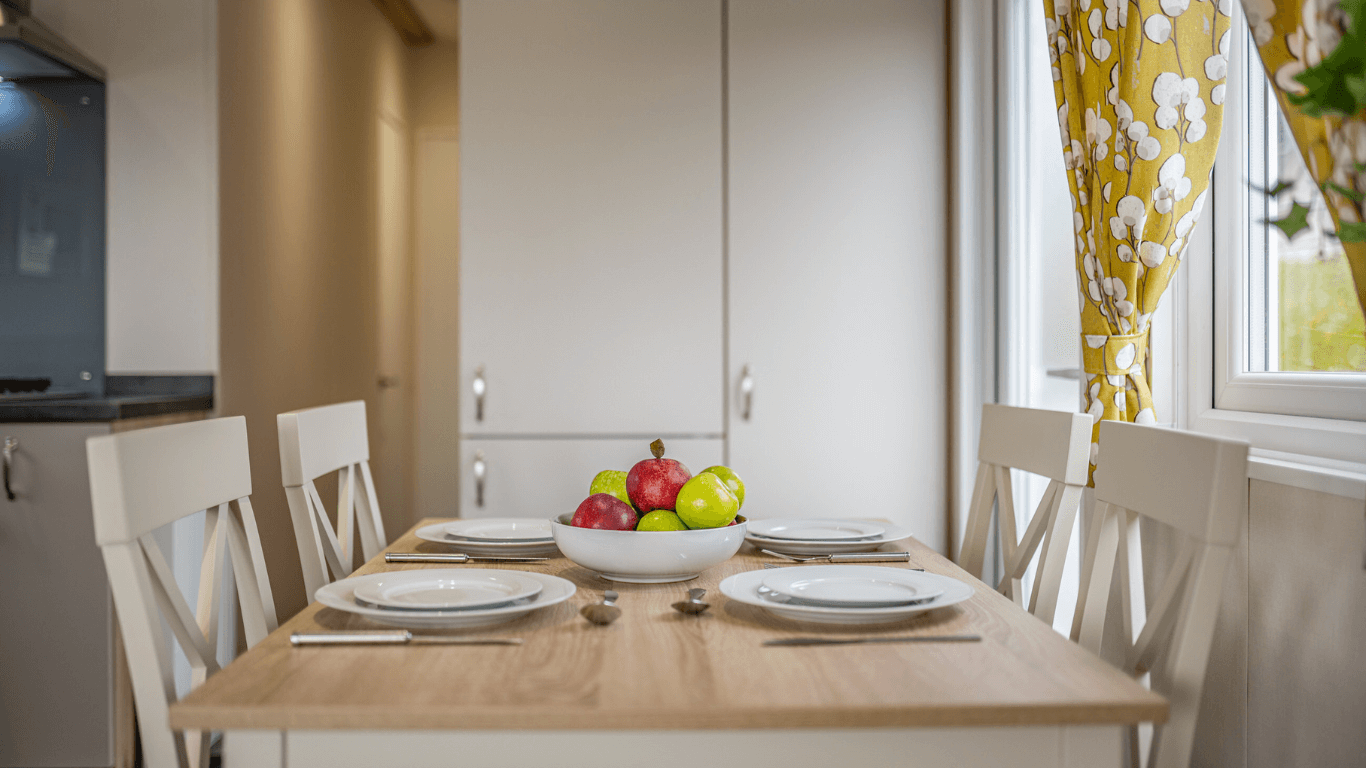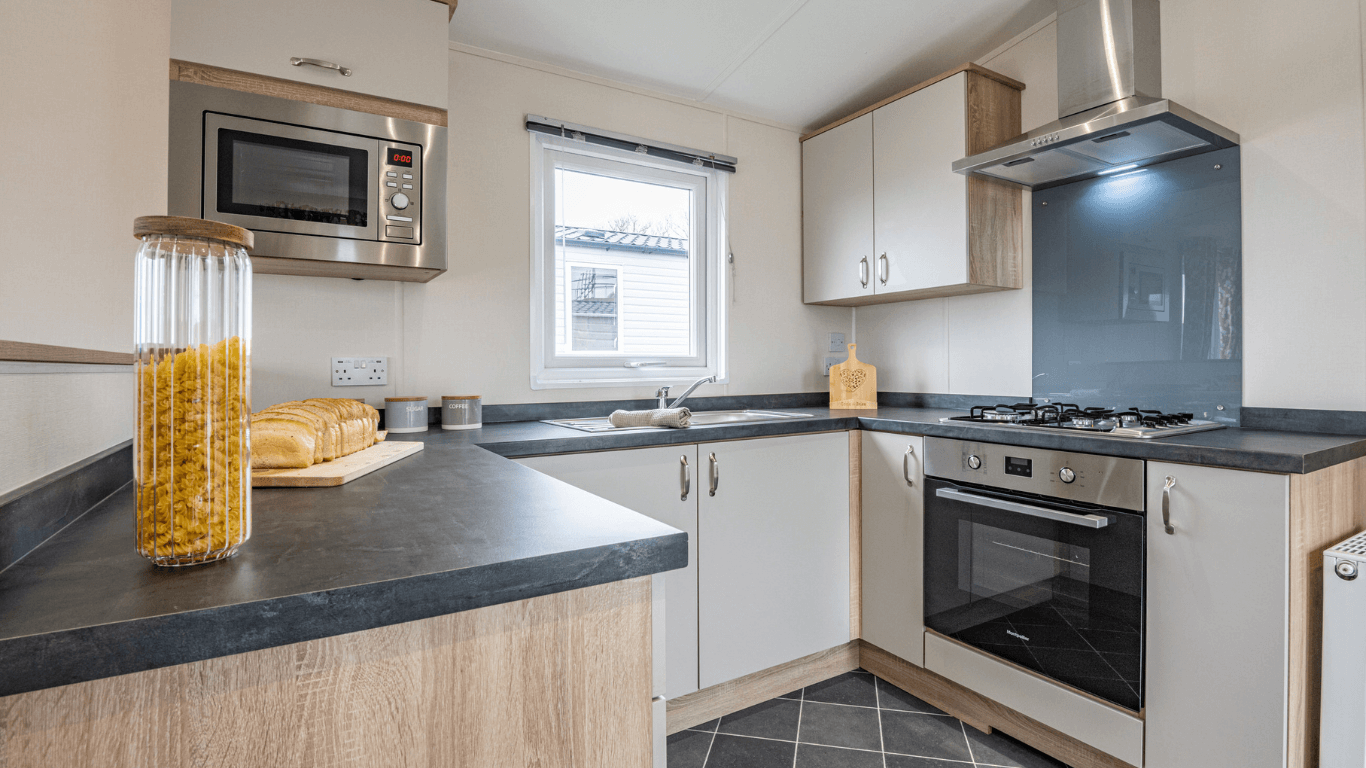 In total there is space for up to six guests in this North Wales holiday home, with space for up to 4 guests in the bedrooms and additional space for 2 people in the lounge thanks to the adaptable pull out sofa bed which is to be found in the lounge. This doubles as a comfortable corner sofa where you can gaze out through the patio doors and enjoy the stunning countryside vistas which surround you at Bryn Defaid Holiday Park.