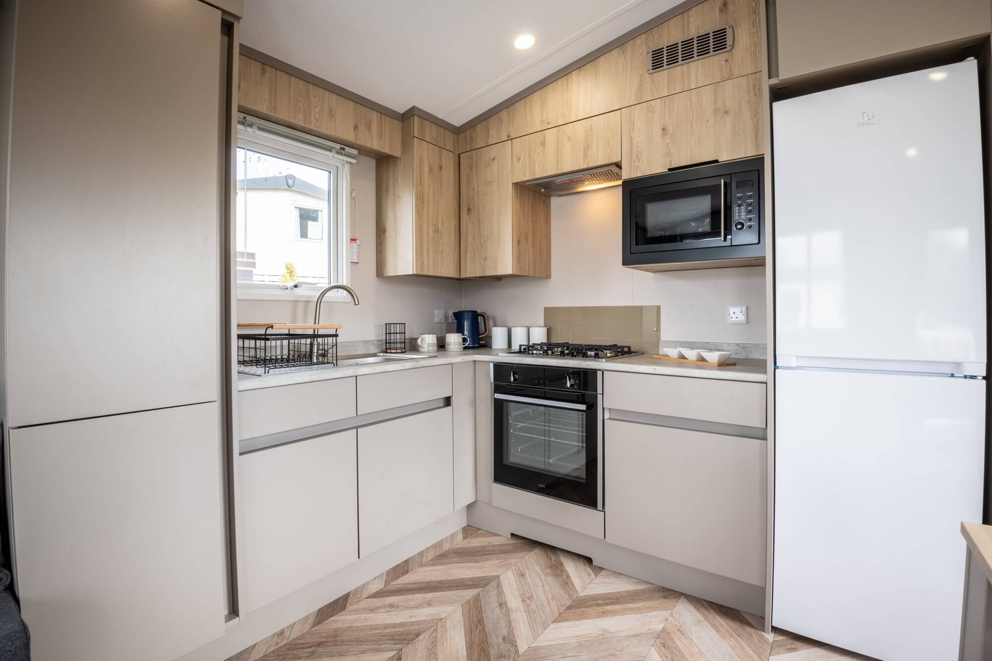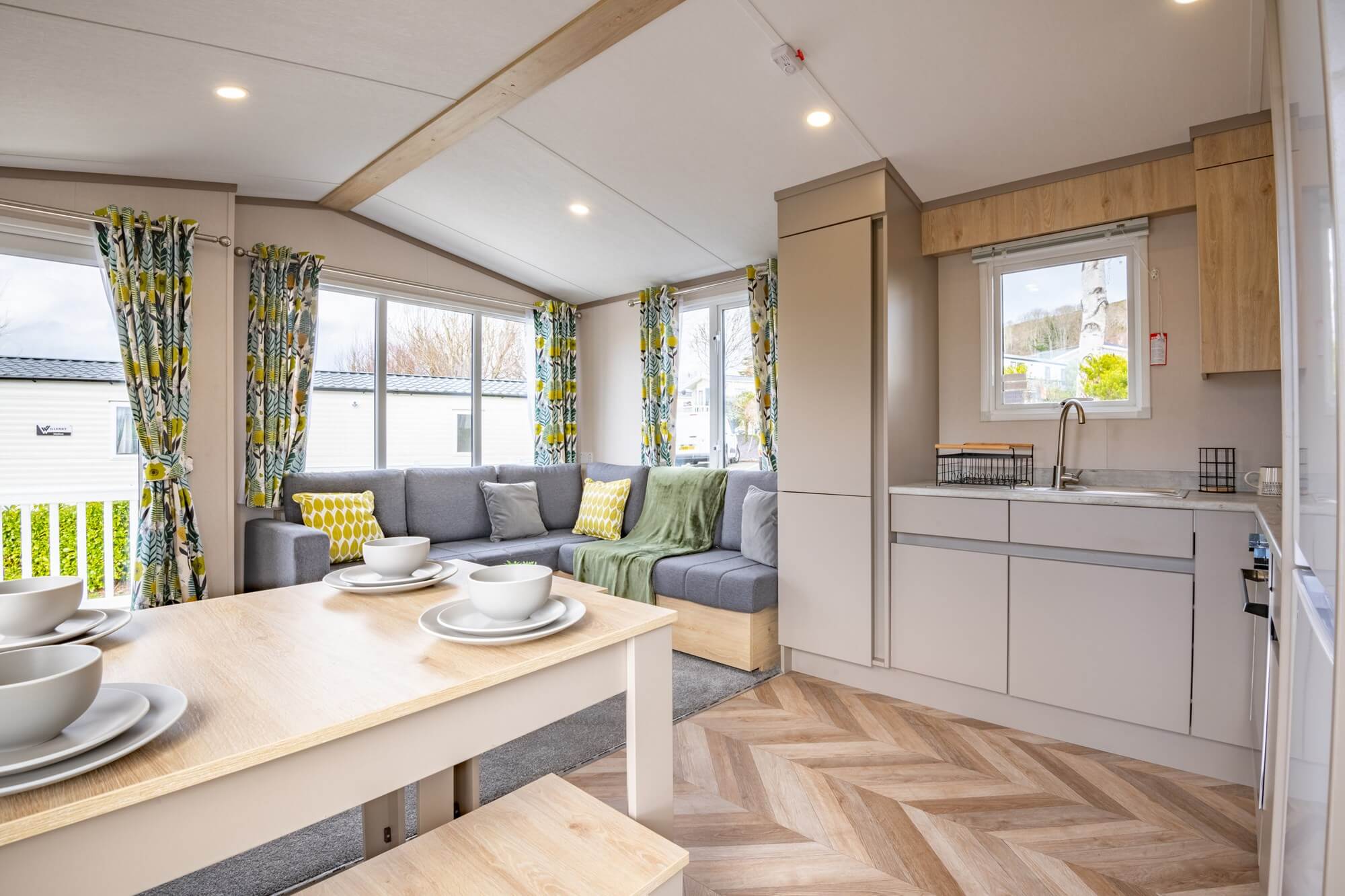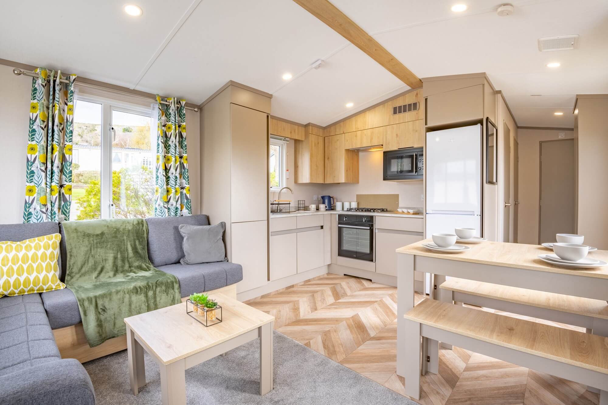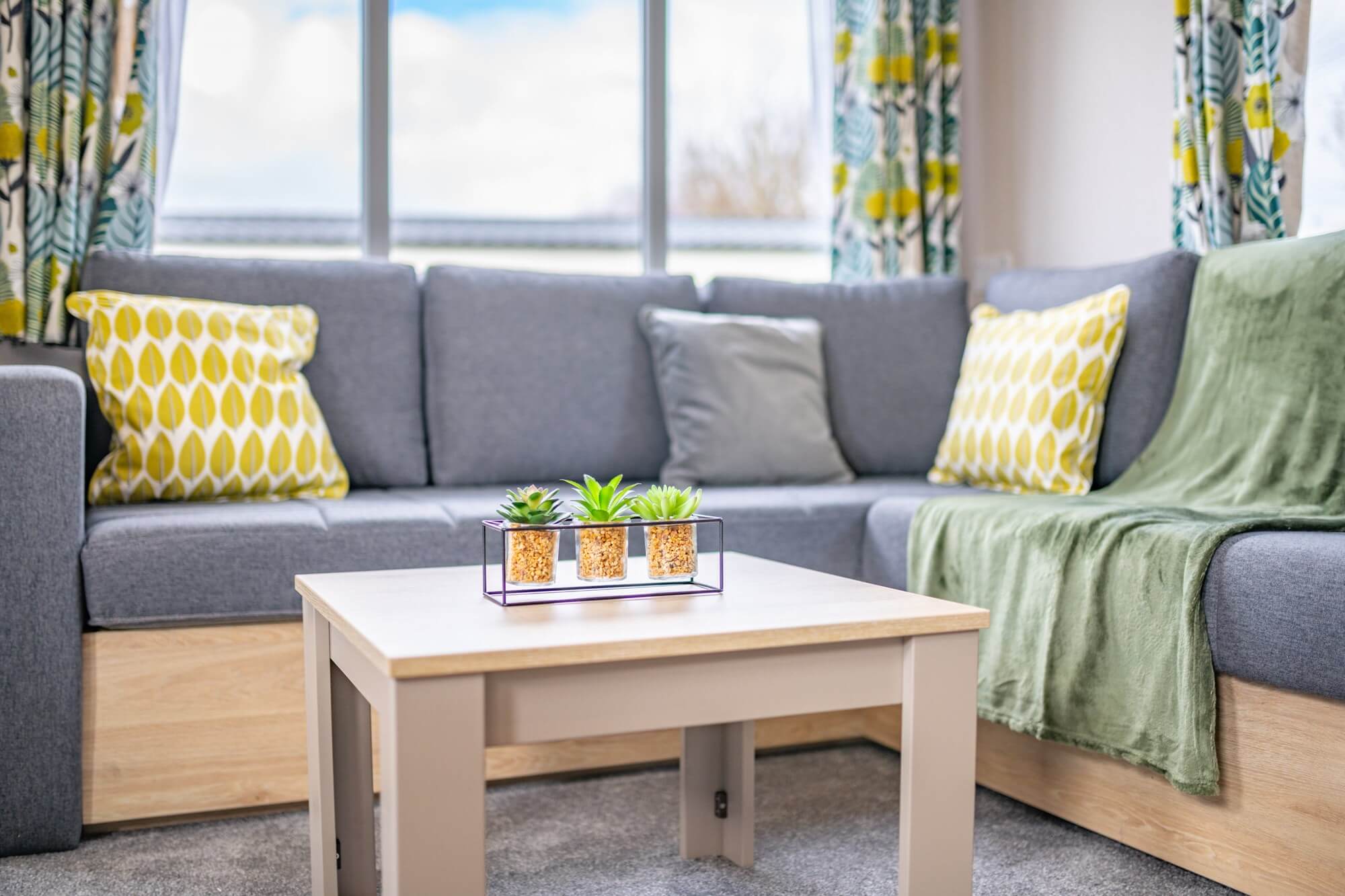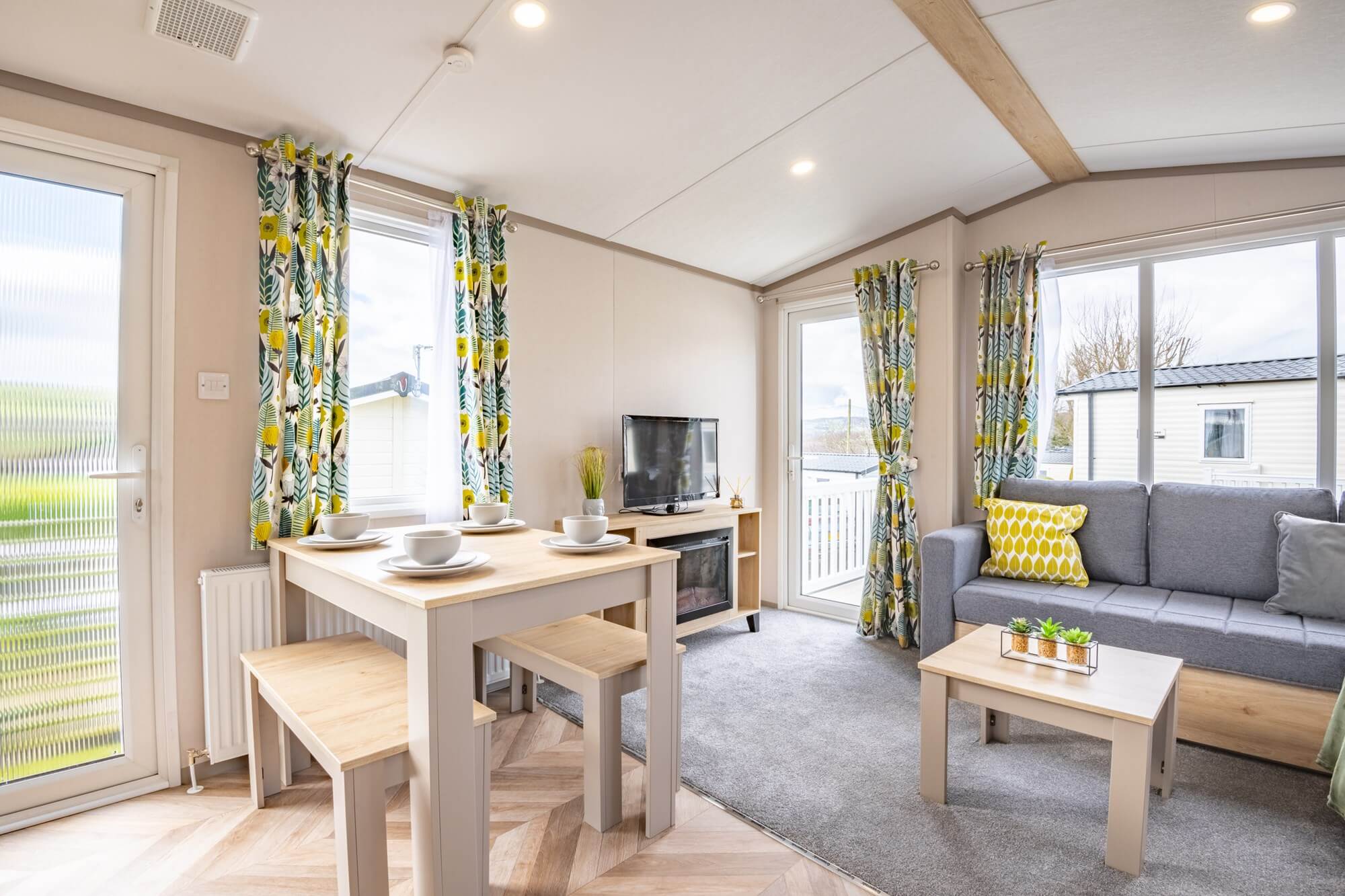 This lounge area is the perfect place in which to cosy up and enjoy a family movie night, with this particular Victory Baywood static caravan coming with a modern flat screen TV and warming fireplace. Combined with the central heating, this makes the Victory Baywood the perfect holiday home in any season.