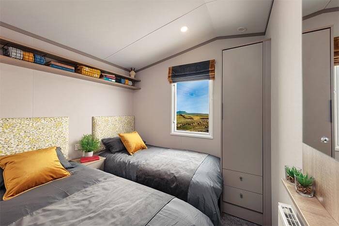 The cosy and relaxing master bedroom combines greys and yellows with natural wood tones and utilises space with great storage a mirrored dressing area and washroom. The same great design theme is continued through into the additional bedrooms, with twin beds and handy built-in storage.