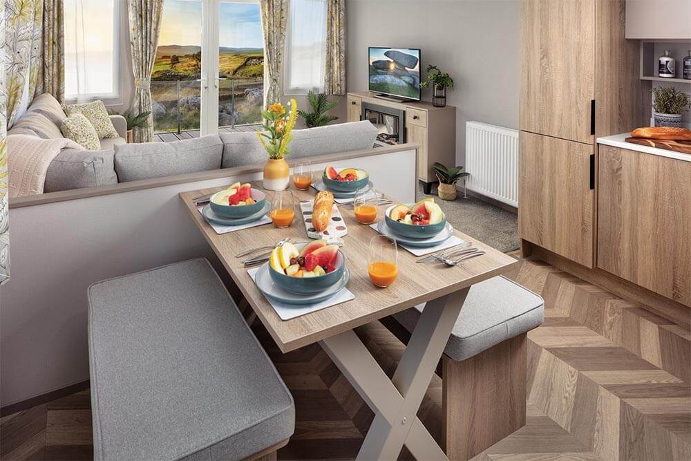 Family dining is ideal in the Stonewood kitchen, the low maintenance, stylish L shaped kitchen with its warm wooden tones offers a great amount of storage with all the kitchen essentials your guests expect and the dining table with matching bench seating is perfect for sitting around to enjoy mealtimes.