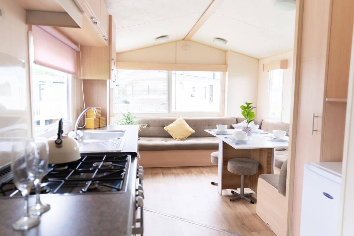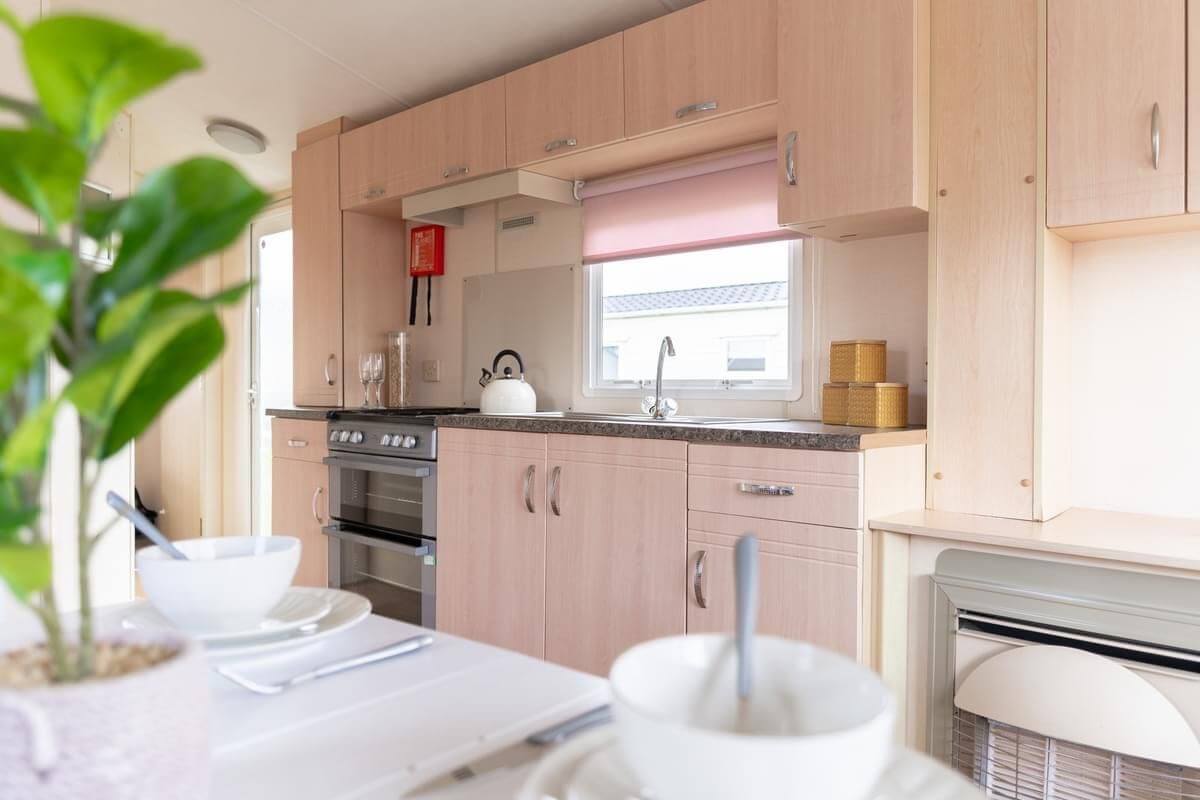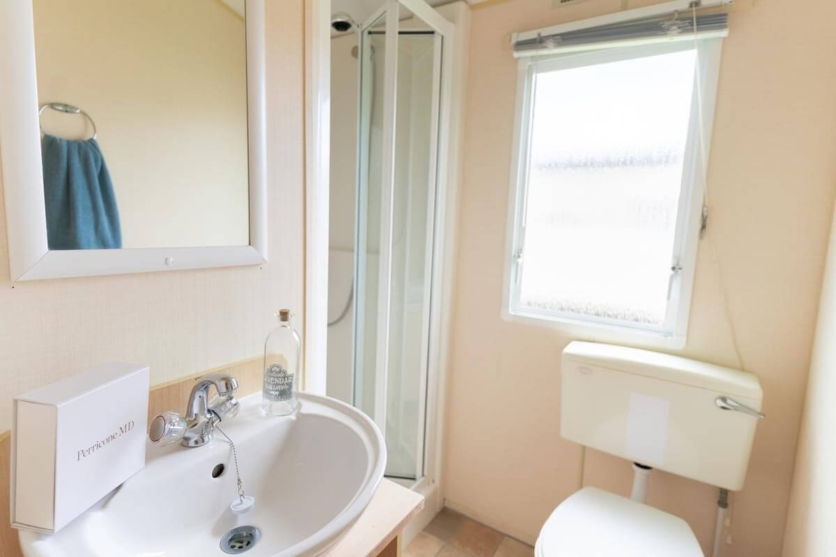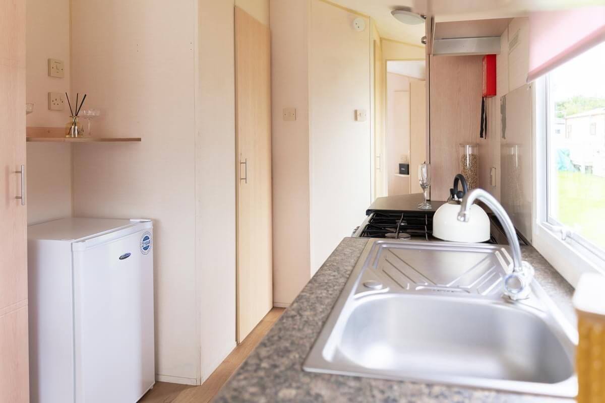 The galley kitchen also has everything you’ll need for self catering with a cooker, separate fridge and freezer, kettle and plenty of space to store your cutlery and tableware. This is all located in the open plan living space where you’ll also find your dining area and lounge which is the perfect space to hangout and plan the many adventures you are going to have whilst staying in the North Wales region.