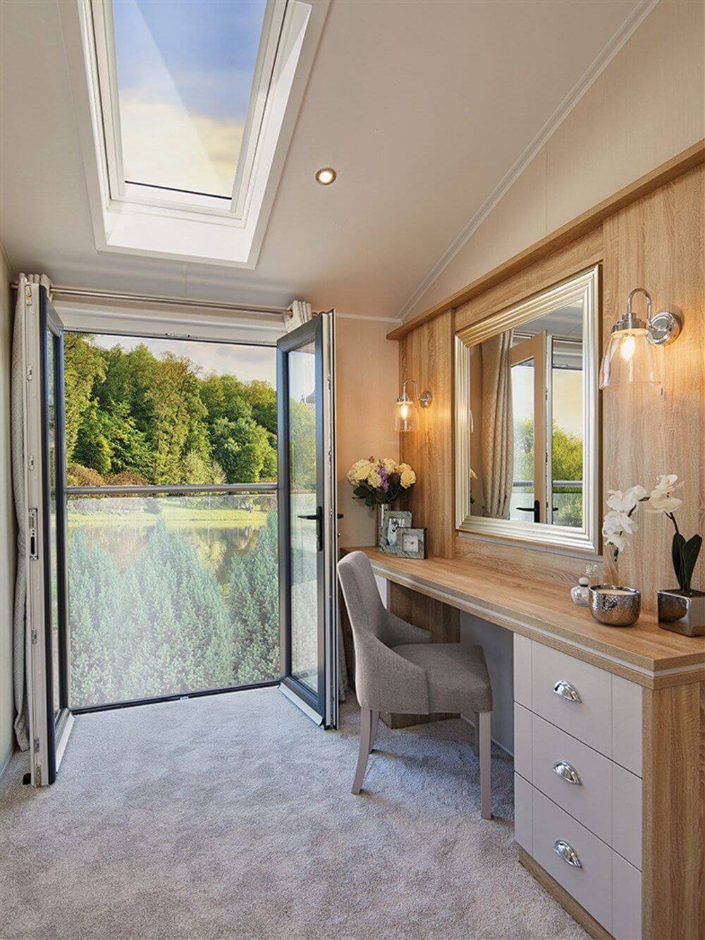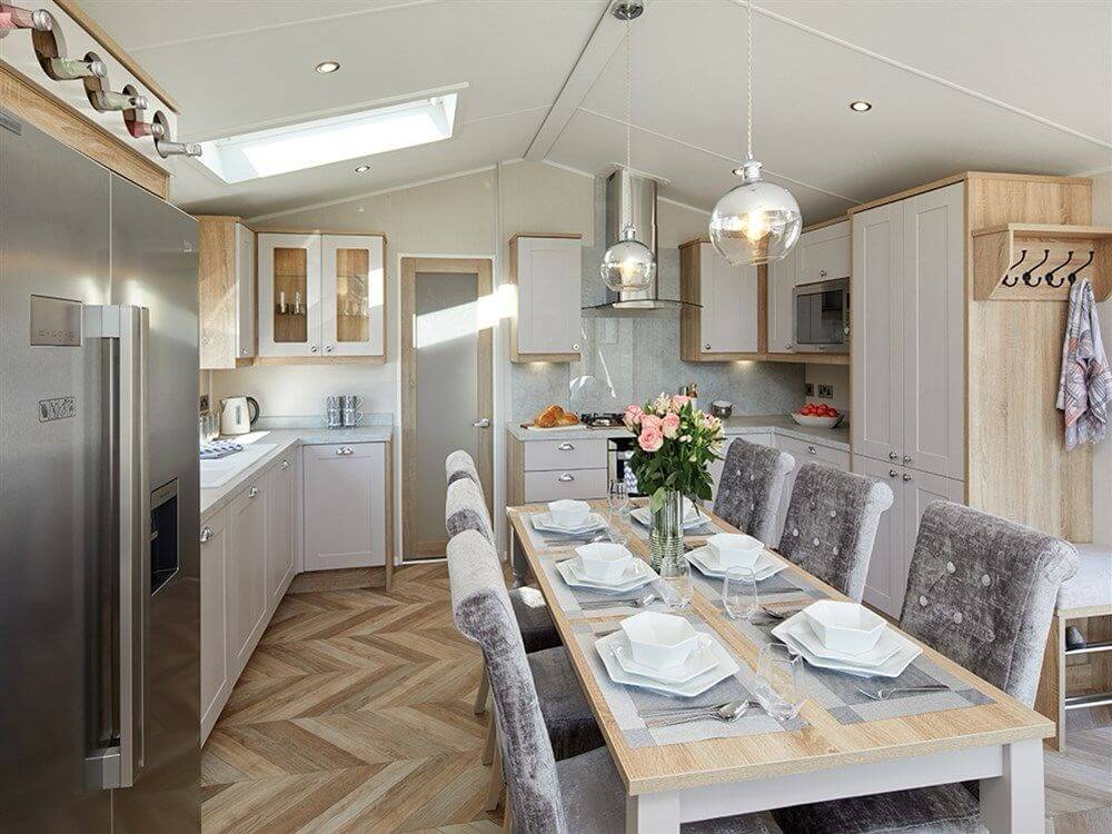 However, the real heart of the Willerby Vogue is its spacious kitchen-diner. A five-burner hob, stainless-steel oven, extractor fan, integrated microwave, dishwasher, washing machine, and cavernous American-style fridge-freezer make meal prep effortless. A skylight above the sink and glass pendants over the dining table add to the bright, sociable atmosphere, with seating for six making this the ideal space for relaxed family dinners