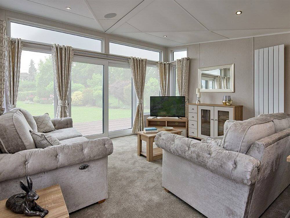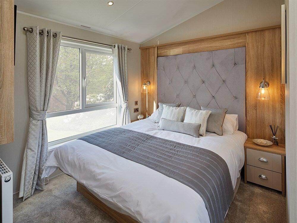 Spanning an impressive 43 × 13 ft and sleeping up to eight guests with three bedrooms, this sizeable model features the vaulted apex-glazed front that floods the lounge with light and offers sweeping views of the surrounding region. The patio doors lead onto a private decking space where you will have more than enough room to place garden furniture.